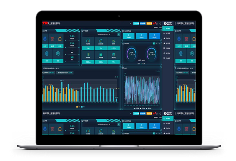 展示页面显示变电站数量、变压器数量、监测点位数量等概况信息,设备通信状态,用电分析和事件记录。首页显示场站的变压器数量、回路个数、有功功率、无功功率、用电量、事件记录等概况信息,可通过实时监控、变压器、通信、视频切换到需要查看的界面。